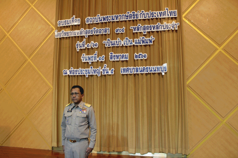 @สพจ.นนทบุรี>วันที่ 15 สิงหาคม 2561 เวลา 09.00 น. นายภานุ แย้มศรี ผู้ว่าราชการจังหวัดนนทบุรี เป็นประธานในพิธีอบรมโครงการจิตอาสาพระราชทานตามแนวพระราชดำริ “หลักสูตรหลักประจำ” รุ่นที่ 1/61 “เป็นเบ้า เป็นแม่พิมพ์” ซึ่งวิทยากรมาอบรมให้ความรู้เรื่องสถาบันพระมหากษัตริย์กับประเทศไทย และทำกิจกรรมสาธารณะประโยชน์ ร่วมกับข้าราชการและประชาชนในพื้นที่จังหวัดนนทบุรีและจังหวัดต่างๆ ทั่วประเทศ ในการนี้ นายอาทร พิมชะนก พัฒนาการจังหวัดพร้อมด้วยหัวหน้ากลุ่มเข้าร่วม ณ ห้องประชุมใหญ่ ชั้น 5 เทศบาลนครนนทบุรี จังหวัดนนทบุรี