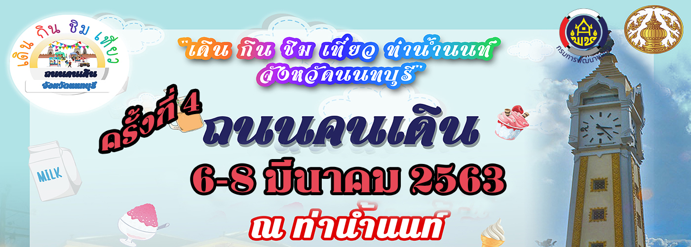 ประชาสัมพันธ์ รับสมัครเข้าร่วมออกบูธและจำหน่ายสินค้า ภายในงาน “เดิน กิน ชิม เที่ยว ท่าน้ำนนท์” จังหวัดนนทบุรี กำหนดจัดงานวันที่ 6-8 มีนาคม 2563 ผู้สนใจสมัครได้ที่ สำนักงานพัฒนาชุมชนจังหวัดนนทบุรี (ศาลากลางจังหวัดฯ ชั้น 2) หรือทาง https://docs.google.com/forms/d/e/1FAIpQLSfbWPf0S–guDeLVKy_916ztL-CzrJPTingDV3rU-C77zzX9Q/viewform สอบถามเพิ่มเติมโทร 025080704 ต่อ 104