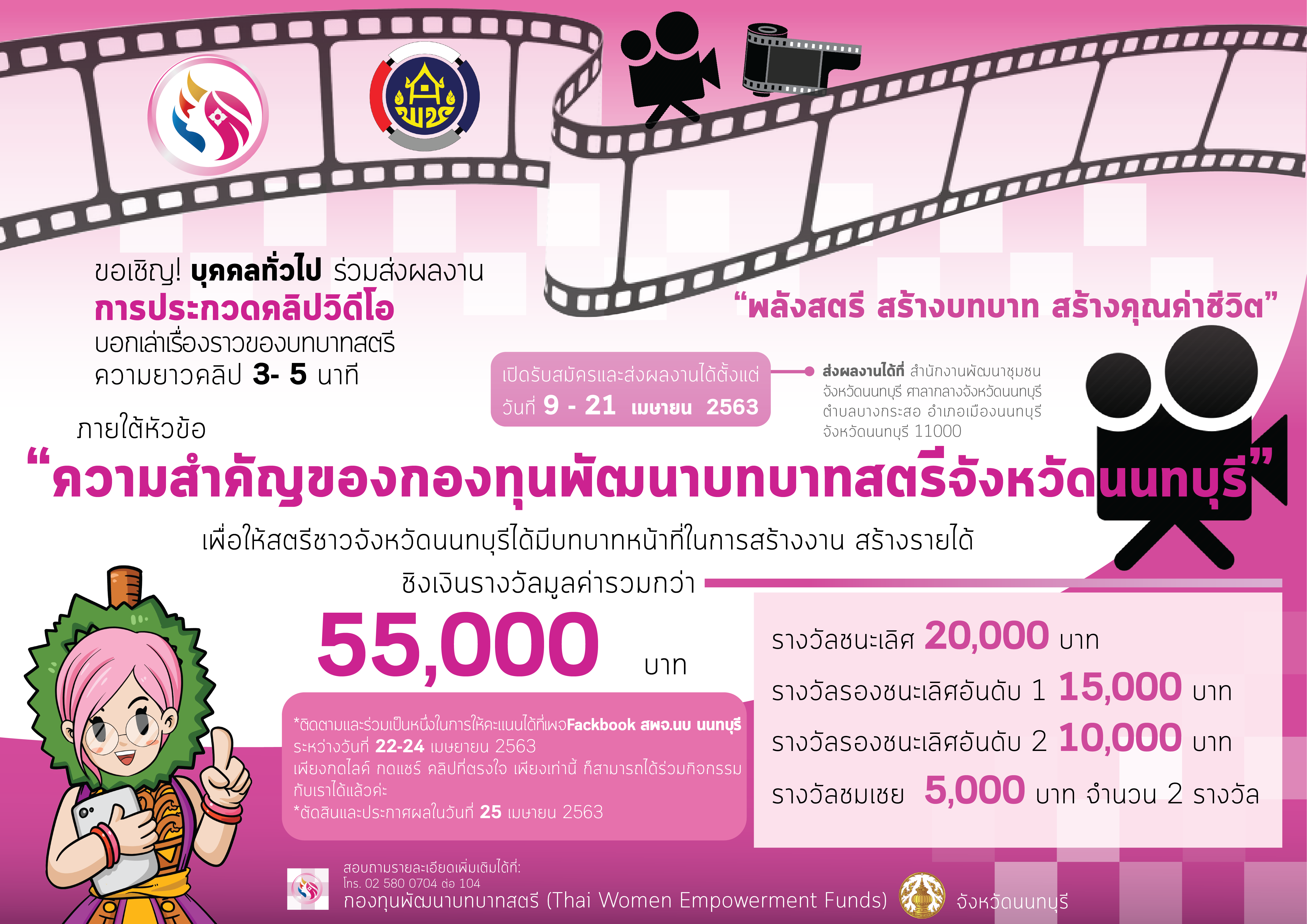 ขอเชิญผู้สนใจ ร่วมส่งผลงานเข้าประกวด คลิปวิดีโอ ความยาว 3-5 นาที ภายใต้หัวข้อ “ความสำคัญของกองทุนพัฒนาบทบาทสตรีจังหวัดนนทบุรี” ชิงเงินรางวัลมูลค่ารวมกว่า 55,000 บาท