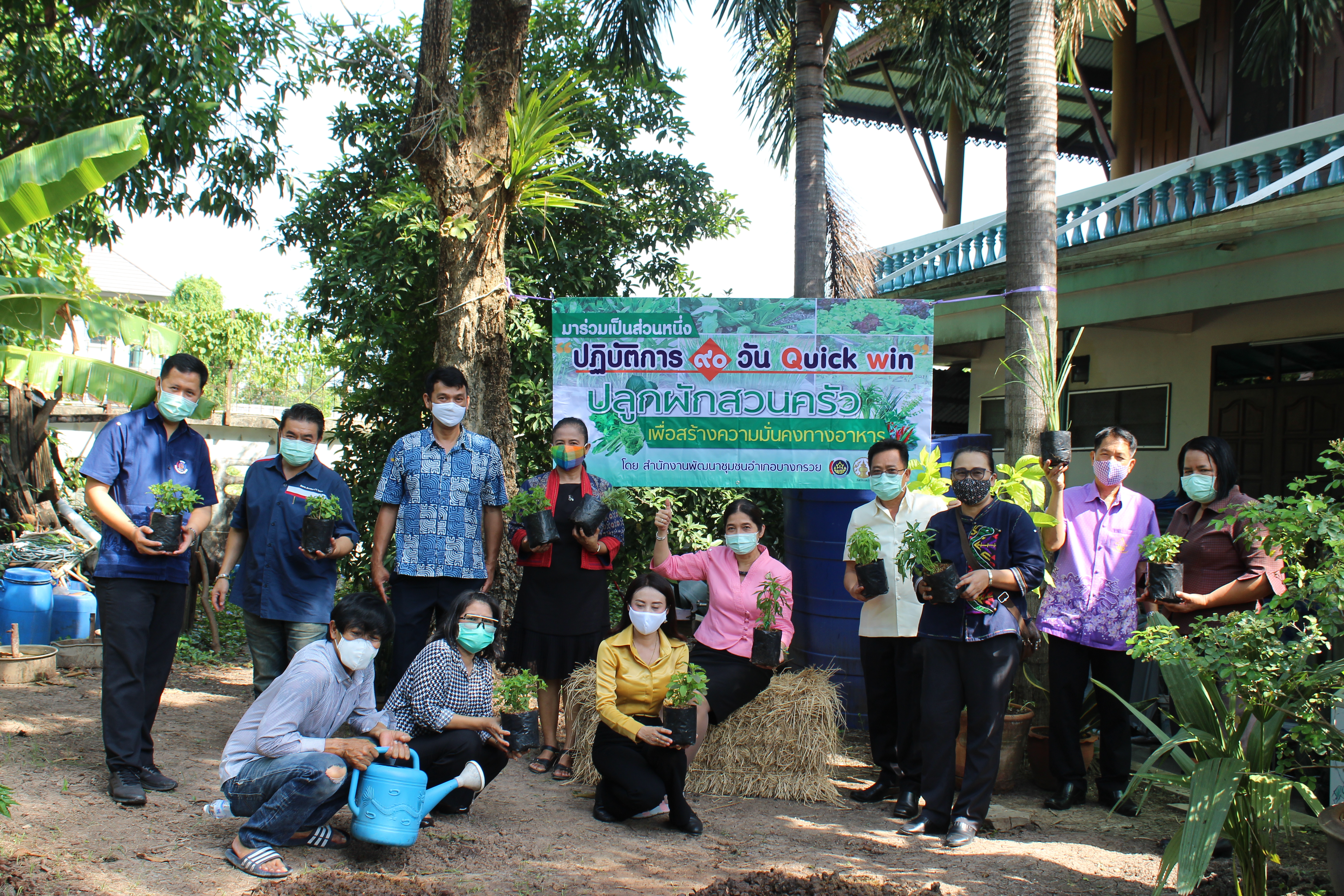 @ข่าวนนทบุรี “เป็นเมืองที่อยู่อาศัยคุณภาพดีและมีเศรษฐกิจสร้างสรรค์” วันที่ 7 พฤษภาคม 2563 เวลา 09.00 น. ณ สถานที่ผลิตสินค้า OTOP อำเภอบางกรวย “โรตีสายไหมเฮียก่ำ” : นางรักใจ กาญจนะวีระ พัฒนาการจังหวัดนนทบุรี , หัวหน้ากลุ่ม/ฝ่าย ,พัฒนาการอำเภอบางกรวย , นายแบงค์ชาติ แก้วชมพู ประธานเครือข่าย OTOP ระดับจังหวัด ,ผู้ประกอบการ OTOP , โอทอปเทรดเดอร์จังหวัดนนทบุรี , ผู้บริหารและเจ้าหน้าที่ อบจ.นนทบุรี , และเจ้าหน้าที่สำนักงานพัฒนาชุมชนจังหวัดนนทบุรี ร่วมกันปลูกผักสวนครัวเพื่อสนองนโยบายตามแผนปฏิบัติการ 90 วัน “ปลูกผักสวนครัว เพื่อสร้างความมั่นคงทางอาหาร”ซึ่งมีครัวเรือนที่ได้รับประโยชน์จากการดำเนินกิจกรรมปลูกผักครั้งนี้ มากกว่า 30 ครัวเรือน ได้แก่ เพื่อนบ้าน ลูกจ้าง เป็นต้น เป็นการแบ่งปันซึ่งกันและกัน ทำให้ช่วยลดรายจ่ายภายในครัวเรือน