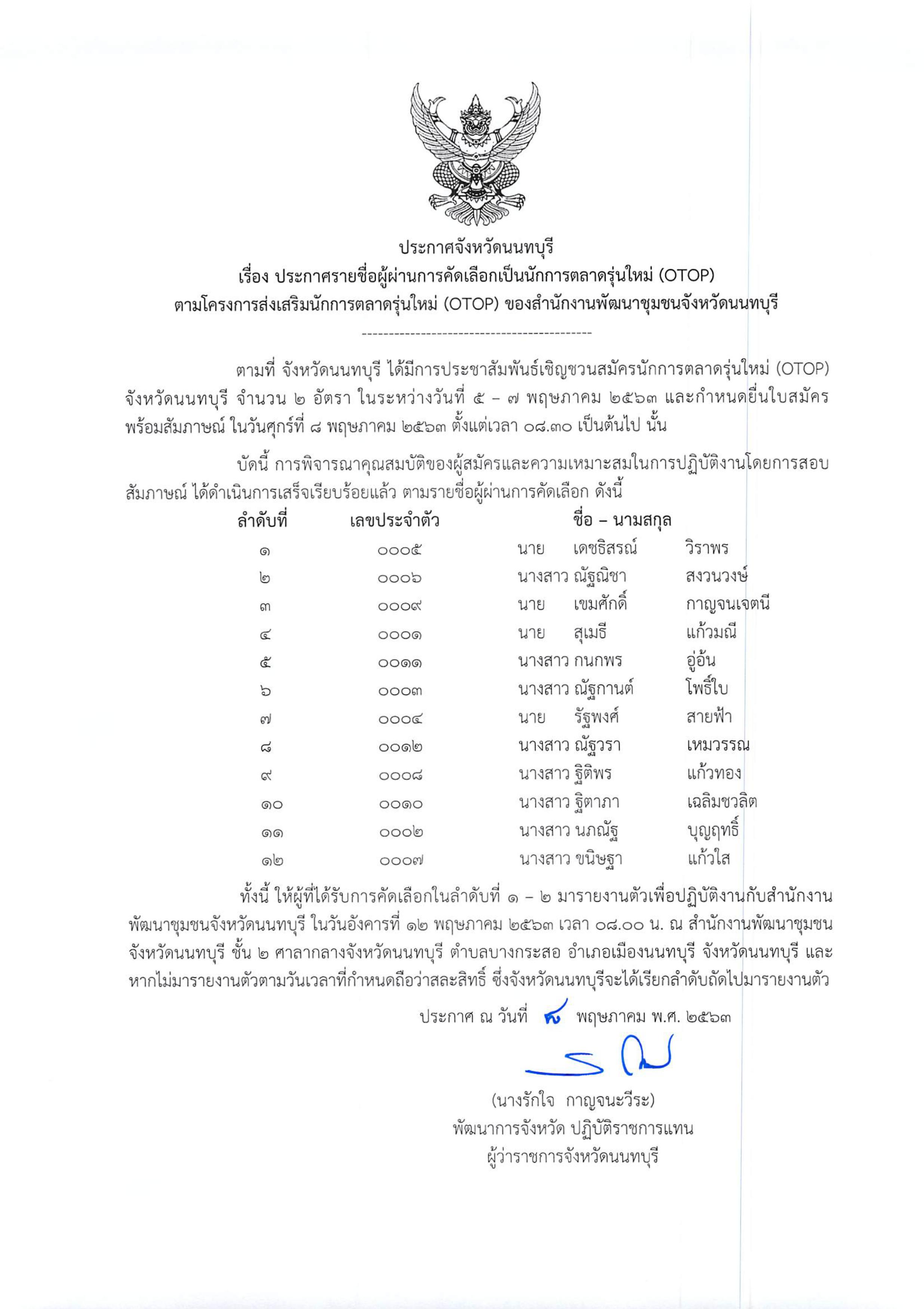 ประกาศ รายชื่อ ผู้ผ่านการคัดเลือก ตำแหน่ง นักการตลาดรุ่นใหม่ (OTOP) จังหวัดนนทบุรี