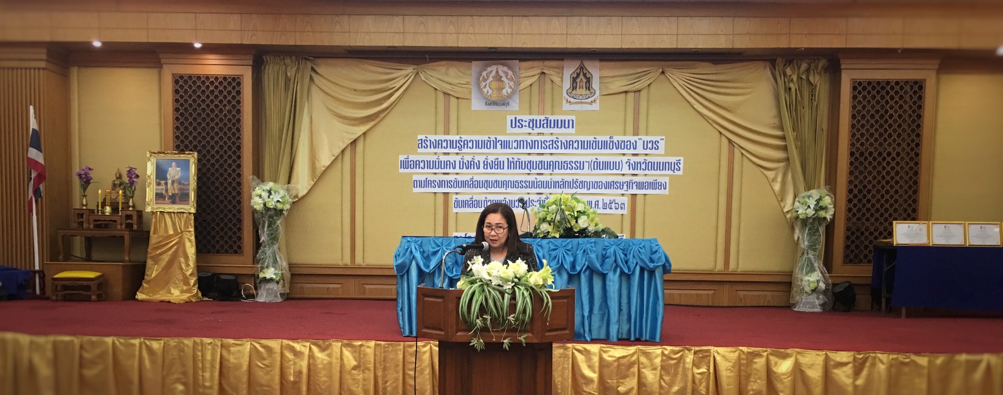 วันที่ 23 กันยายน 2563 เวลา 09.00 น. ณ โรงแรมเดอะริช อำเภอเมืองนนทบุรี จังหวัดนนทบุรี นางนิศากร วิศิษฏ์สรอรรถ รองผู้ว่าราชการจังหวัดนนทบุรี เป็นประธานในพิธีเปิดการประชุมสัมนาสร้างความรู้ความเข้าใจ แนวทางการสร้างความเข้มแข็งของ “บวร” เพื่อความมั่นคง มั่งคั่ง ยั่งยืน ให้กับชุมชนคุณธรรมฯ (ต้นแบบ) จังหวัดนนทบุรี จัดโดย สำนักงานวัฒนธรรมจังหวัดนนทบุรี โดยมีผู้เข้าร่วมการประชุมประกอบด้วยหัวหน้าส่วนราชการ ตัวแทนส่วนราชการ และผู้นำองค์กรชุมชน เข้าร่วมการประชุมในครั้งนี้