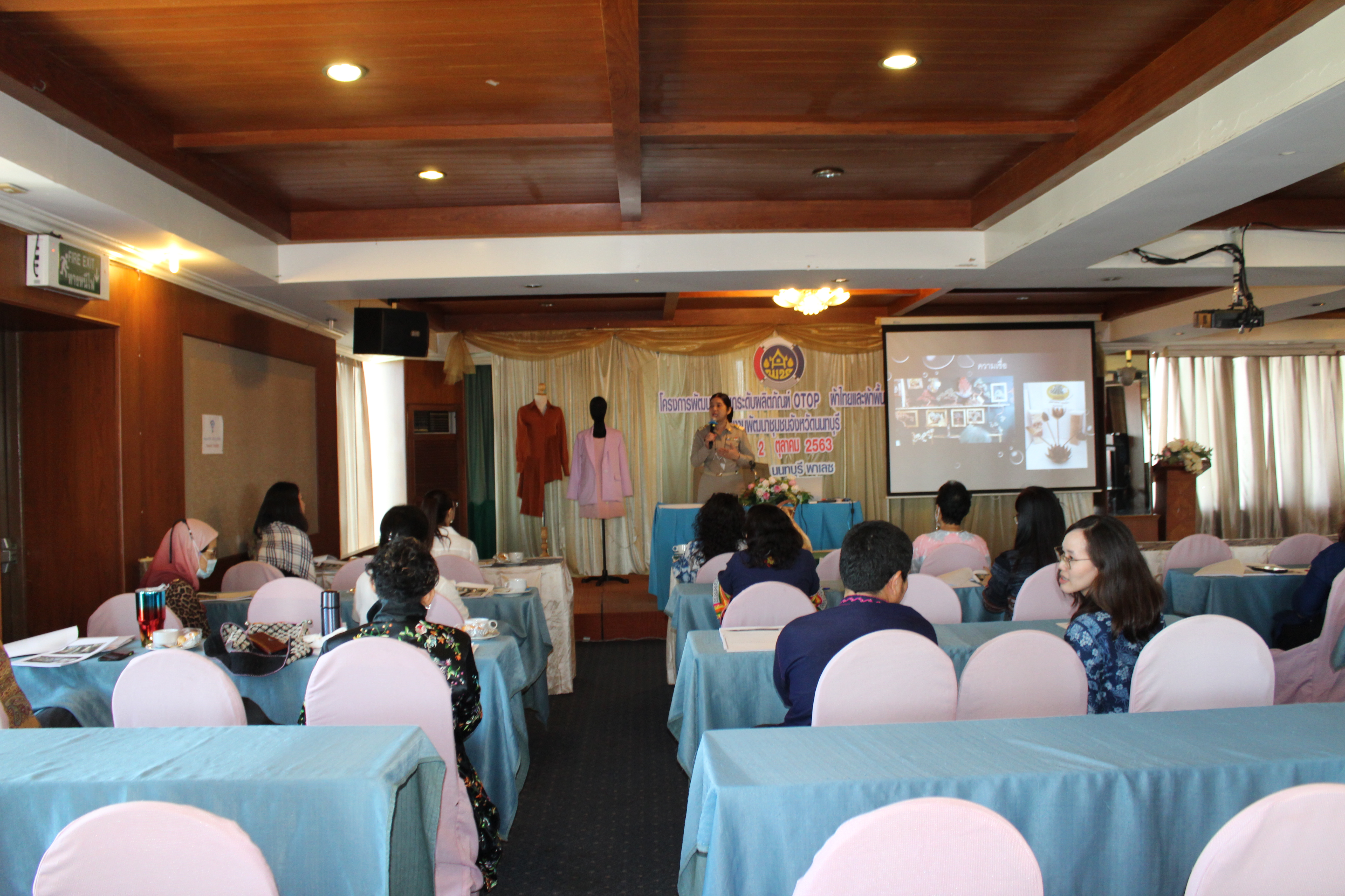 วันที่ 2 ตุลาคม 2563 ณ โรงแรมนนทบุรีพาเลซ อ.เมืองนนทบุรี จ.นนทบุรี นางรักใจ กาญจนะวีระ พัฒนาการจังหวัดนนทบุรี เป็นประธานในพิธีเปิดโครงการพัฒนาและยกระดับผลิตภัณฑ์ OTOP ผ้าไทยและผ้าพื้นเมือง พร้อมด้วย นางวชิรพร แจ้งเอี่ยม ผู้อำนวยการกลุ่มงานส่งเสริมการพัฒนาชุมชน เจ้าหน้าที่สำนักงานพัฒนาชุมชนจังหวัดและอำเภอ และผู้ผลิต ผู้ประกอบการOTOP ประเภทผ้าและเครื่องแต่งกาย