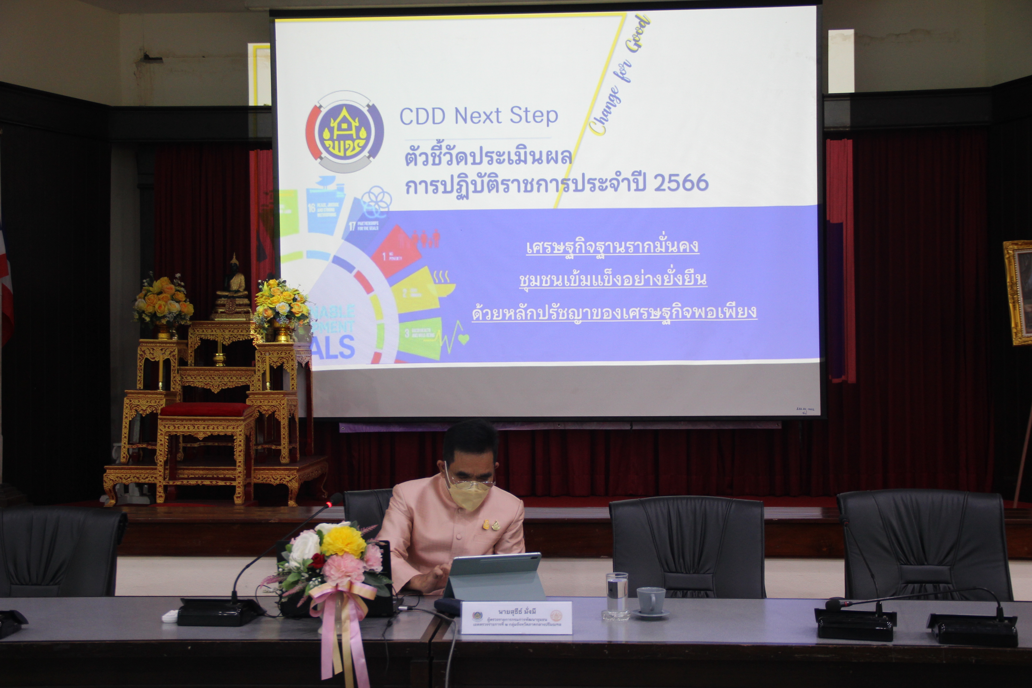 จากนั้นเวลา ๐๙.๓๐ น. นายสุธีธ์ มั่งมี ผู้ตรวจราชการกรมการพัฒนาชุมชน รับผิดชอบเขตตรวจราชการที่ ๒ กลุ่มจังหวัดภาคกลางปริมณฑล ได้ให้เกียรติชี้แจงตัวชี้วัดในการปฏิบัติราชการและถ่ายทอดตัวชี้วัดให้แก่บุคลากรในสังกัดสำนักงานพัฒนาชุมชนจังหวัดนนทบุรี ในการปฏิบัติราชการและขับเคลื่อนผลการดำเนินงานให้บรรลุวัตถุประสงค์และเป้าหมายที่กรมการพัฒนาชุมชนกำหนดไว้ ในการนี้ผู้ตรวจกรมการพัฒนาชุมชนได้ให้โอวาทและให้กำลังใจในการปฏิบัติงานแก่บุคลากรทุกคน จากนั้นได้จัดกิจกรรมพิธีลงนามคำรับรองการปฏิบัติราชการ ประจำปีงบประมาณ พ.ศ. ๒๕๖๖ ระหว่างพัฒนาการจังหวัด ผู้อำนวยการกลุ่มงาน จำนวน ๔ กลุ่มงานและพัฒนาการอำเภอ จำนวน ๖ อำเภอ กิจกรรมนำเสนอ Show Case ตัวชี้วัดการปฏิบัติราชการของสำนักงานพัฒนาชุมชนอำเภอที่คาดว่าจะดำเนินการได้สำเร็จในระดับค่าคะแนนที่ ๕ และกิจกรรมถ่ายทอดการขับเคลื่อนตัวชี้วัดสำนักงานพัฒนาชุมชนจังหวัดนนทบุรี พร้อมทั้งเตรียมความพร้อมการขับเคลื่อนงานตามโครงการพัฒนาชุมชนใสสะอาด ประจำปีงบประมาณ พ.ศ. ๒๕๖๖ สำนักงานพัฒนาชุมชนจังหวัดนนทบุรี ในทุกมิติ โดยผู้อำนวยการกลุ่มงานทุกกลุ่มงาน
