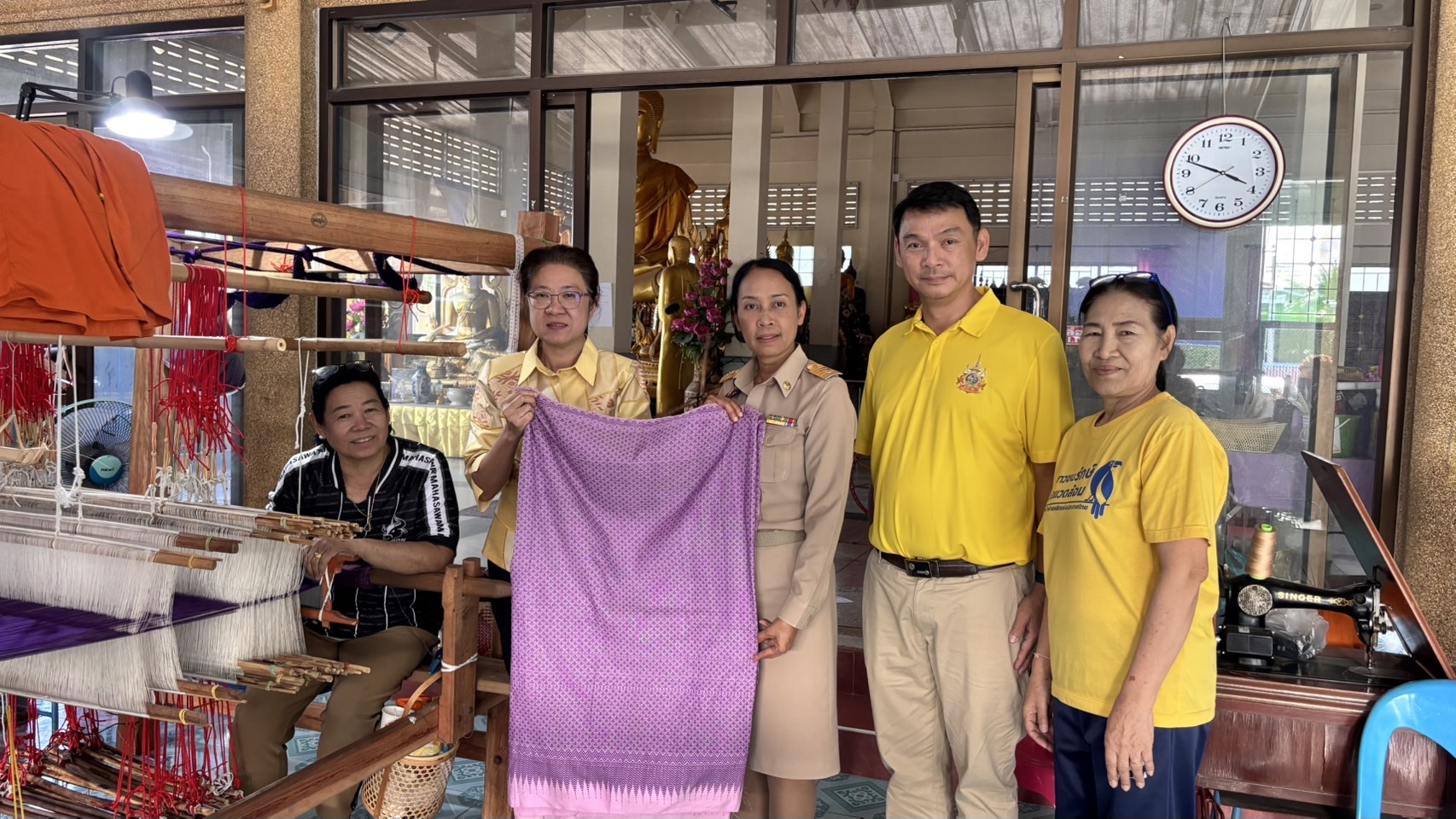 วันจันทร์ที่ 16 ธันวาคม 2567 นางระวีพรรณ แก้วเพียงเพ็ญ รองผู้ว่าราชการจังหวัดนนทบุรี นางประภา ปานนิตยกุล พัฒนาการจังหวัดนนทบุรี นายอุดมศักดิ์ ปานศรี พัฒนาการอำเภอบางกรวย พร้อมด้วยเจ้าหน้าที่พัฒนาชุมชนจังหวัด/อำเภอ ลงพื้นที่เยี่ยมเยียนศูนย์ทอผ้าจังหวัดนนทบุรี “กลุ่มรวมใจรักษ์มหาสวัสดิ์” เพื่อพูดคุยให้คำปรึกษา เรื่องการพัฒนา และการเพิ่มช่องทางในการทอผ้า ให้กับศูนย์ทอผ้าจังหวัดนนทบุรี ทั้งนี้ได้กราบนมัสการและหารือการดำเนินงานศูนย์ทอผ้าจังหวัดนนทบุรีกับพระครูนนทวีรวัฒน์ เจ้าคณะตำบลมหาสวัสดิ์และเจ้าอาวาสวัดโคสอนมหาสวัสดิ์