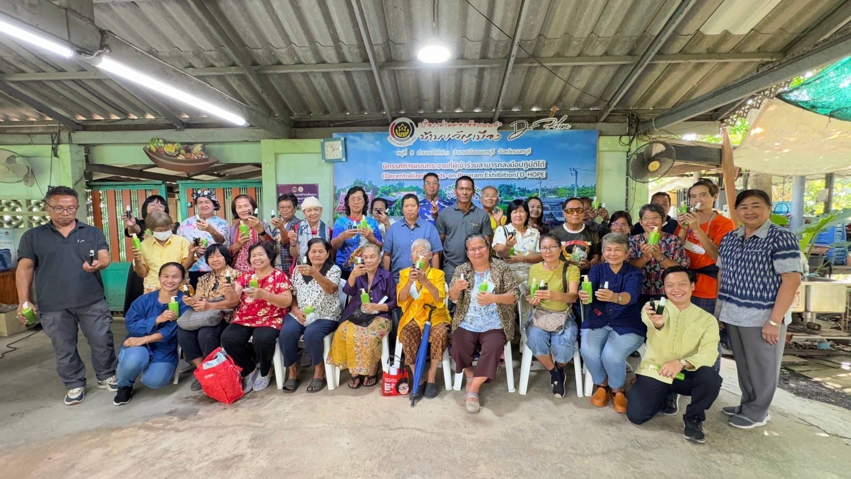 5. การสาธิตและแบ่งกลุ่มฝึกปฏิบัติการทำน้ำมันเขียว การทำน้ำมันเขียวคลายเส้น การทำสเปรย์กันยุงตะไคร้หอมและเสลดพังพอน และการทำสบู่เหลวน้ำผึ้งชันโรง