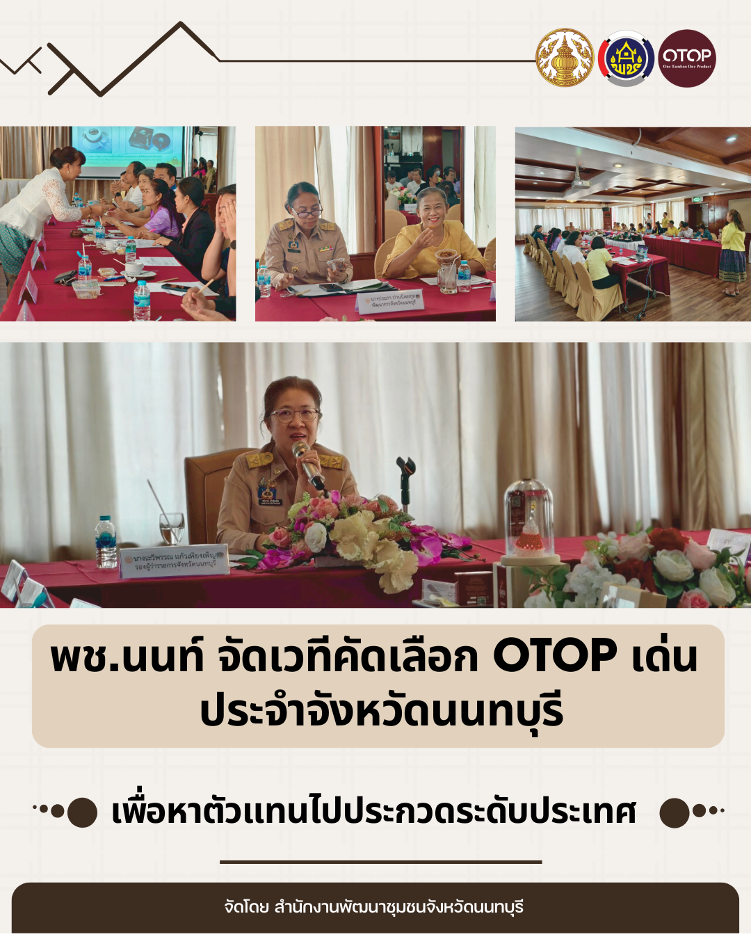 วันจันทร์ที่ 21 เมษายน 2568 นางระวีพรรณ แก้วเพียงเพ็ญ รองผู้ว่าราชการจังหวัดนนทบุรี ได้เป็นประธานร่วมคัดเลือกผลิตภัณฑ์เด่นของจังหวัดนนทบุรี ร่วมกับคณะกรรมการเครือข่าย KBO ประกอบด้วย นางประภา ปานนิตยกุล พัฒนาการจังหวัดนนทบุรี ผู้อำนวยการพัฒนาชุมชน ผู้ทรงคุณวุฒิ คณาจารย์ ผู้เชี่ยวชาญ เข้าร่วมการคัดเลือกผลิตภัณฑ์ในครั้งนี้ ณ โรงแรมนนทบุรี พาเลซ จ.นนทบุรี ซึ่งจัดขึ้นโดยสำนักงานพัฒนาชุมชนจังหวัดนนทบุรี ภายใต้โครงการพัฒนาผลิตภัณฑ์ OTOP โดยเครือข่ายองค์ความรู้ (Knowledge-Base OTOP : KBO) จังหวัด กิจกรรมถอดบทเรียนและเวทีคัดเลือกผลิตภัณฑ์เด่น