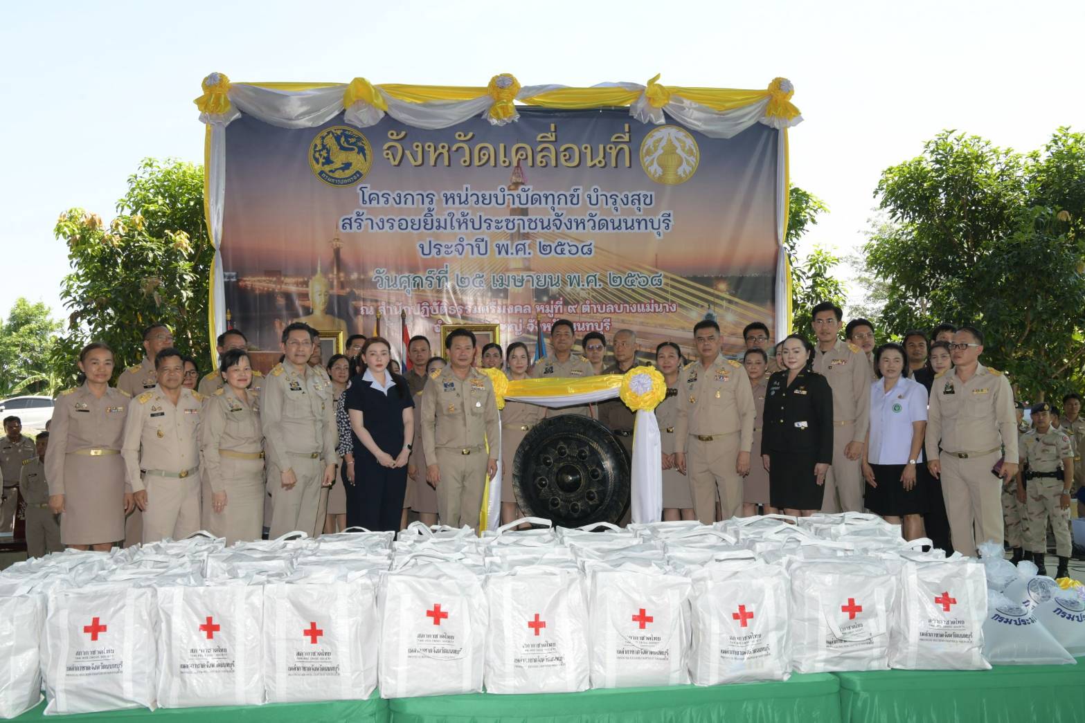 🎊🎊 วันที่ 25 เมษายน 2568 เวลา 09.30 น. ณ ศูนย์ปฏิบัติธรรมศรีมงคล หมู่ที่ 9 ตำบลบางแม่นาง อำเภอบางใหญ่ จังหวัดนนทบุรี นายเกียรติศักดิ์ ตรงศิริ ผู้ว่าราชการจังหวัดนนทบุรี เป็นประธานในโครงการ “หน่วยบำบัดทุกข์ บำรุงสุข สร้างร้อยยิ้มให้ประชาชน” จังหวัดนนทบุรี ประจำปี พ.ศ. 2568 พร้อมด้วยหัวหน้าส่วนราชการ หัวหน้าหน่วยงานรัฐวิสาหกิจ ภาคเอกชน และประชาชน โดยที่ทำการปกครองจังหวัดนนทบุรี จัดขึ้นเพื่อเป็นการสนองนโยบายของกระทรวงมหาดไทย กรมการปกครอง และจังหวัดนนทบุรี ซึ่งมีกิจกรรมการปล่อยพันธุ์ปลา ปลูกต้นไม้ประจำจังหวัด การมอบพันธุ์ปลาให้แก่ผู้นำหมู่บ้าน การถวายผ้าป่าสมทบกองทุนแม่ของแผ่นดิน มอบทุนการศึกษาเด็กเล็ก มอบเงินสงเคราะห์แก่ผู้ยากไร้ และมอบถุงยังชีพให้คนชราและผู้ยากไร้ รวมถึงการนำงานบริการจากหน่วยงานต่าง ๆ ไปบริการในพื้นที่ อาทิ การตรวจสุขภาพของประชาชน การจำหน่ายต้นไม้พืชพันธุ์ผักผลไม้ การให้บริการปรึกษาด้านการเงินแบะกองทุนต่าง ๆ การให้ความรู้เกี่ยวกับการเลือกตั้ง ตลอดจนเป็นการติดตามการดำเนินการ/โครงการต่าง ๆ ตามนโยบายของรัฐบาล กระทรวง กรม และจังหวัดนนทบุรี
