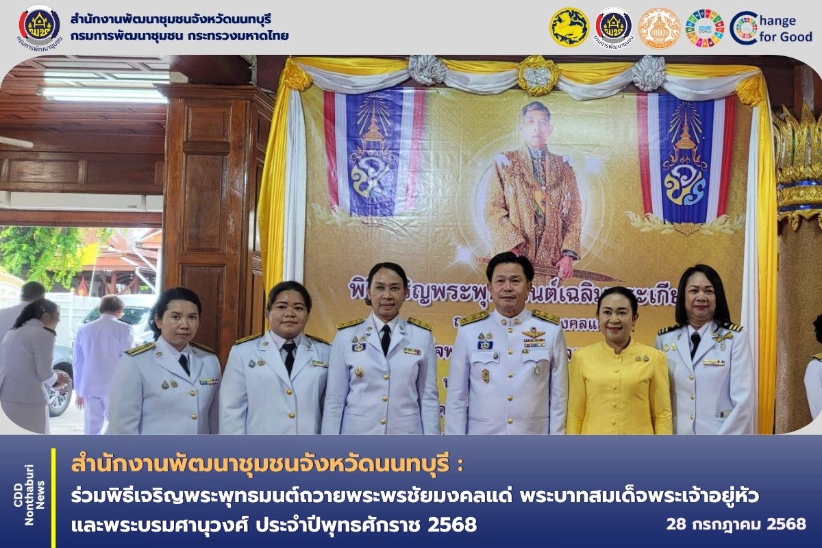วันที่ 28 กรกฎาคม 2568 เวลา 14.00 น. ณ วัดบางไผ่ พระอารามหลวง ตำบลบางรักพัฒนา อำเภอบางบัวทอง จังหวัดนนทบุรี นายเกียรติศักดิ์ ตรงศิริ ผู้ว่าราชการจังหวัดนนทบุรี เป็นประธานในพิธีจดธูปเทียน ถวายราชสักการะหน้าพระบรมฉายาลักษณ์พระบาทสมเด็จพระเจ้าอยู่หัว พร้อมด้วยหัวหน้าส่วนราชการ ข้าราชการ และพุทธศาสนิกชน ร่วมเจริญพระพุทธมนต์และเจริญสมาธิบำเพ็ญภาวนา รวมพลังถวายพระพรชัยมงคลแด่ พระบาทสมเด็จพระเจ้าอยู่หัว และพระบรมศานุวงศ์ ประจำปีพุทธศักราช 2568
