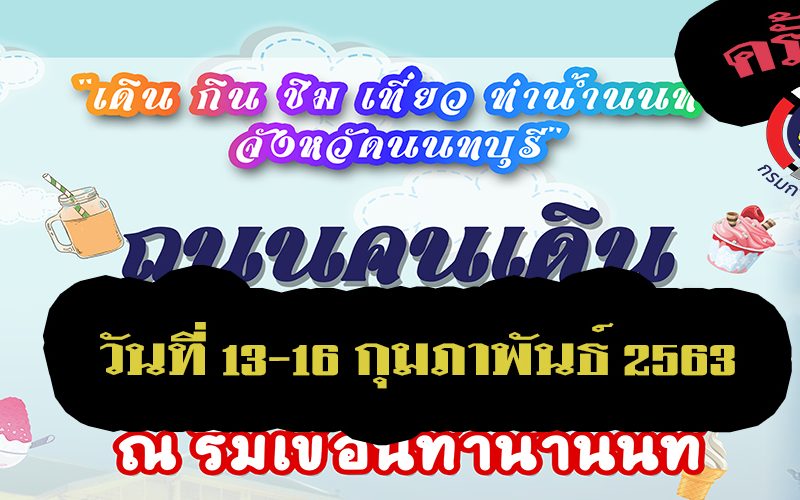 ขอเชิญผู้ประกอบการร่วมออกร้านจำหน่ายสินค้า ภายในงาน “เดิน กิน ชิม เที่ยว ท่าน้ำนนท์ จังหวัดนนทบุรี” ระหว่างวันที่ 13-16 กุมภาพันธ์ 2563