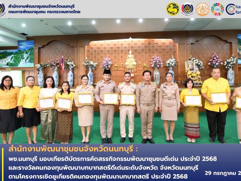 พช.นนทบุรี มอบเกียรติบัตรการคัดสรรกิจกรรมพัฒนาชุมชนดีเด่น ประจำปี 2568 และรางวัลคนกองทุนพัฒนาบทบาทสตรีดีเด่นระดับจังหวัด จังหวัดนนทบุรี ตามโครงการเชิดชูเกียรติคนกองทุนพัฒนาบทบาทสตรี ประจำปี 2568