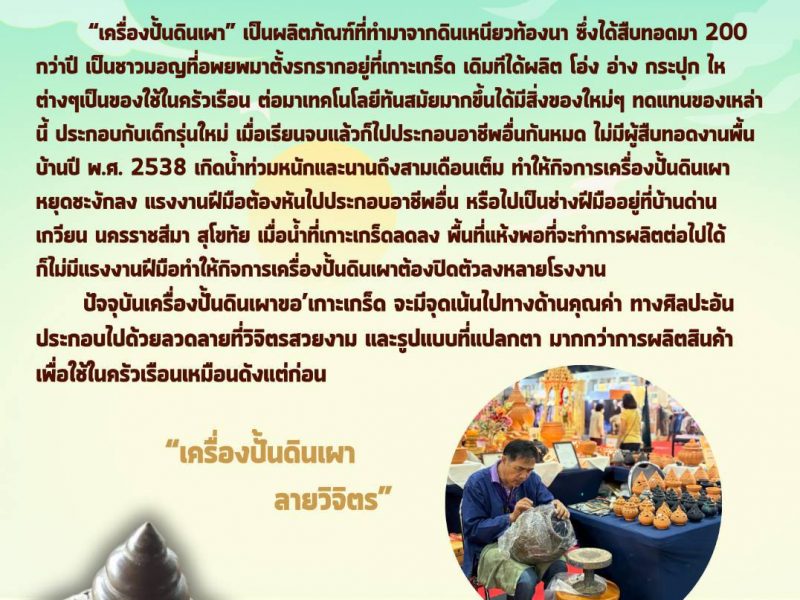 สำนักงานพัฒนาชุมชนจังหวัดนนทบุรี ขอเชิญเที่ยวชมผลงาน ศิลปิน OTOP เครื่องปั้นดินเผา ร่วมสัมผัสเสน่ห์งานฝีมือดั้งเดิมจากเกาะเกร็ด ที่เต็มไปด้วยลวดลายวิจิตร รูปแบบหลากหลาย สะท้อนภูมิปัญญาไทยอย่างงดงาม