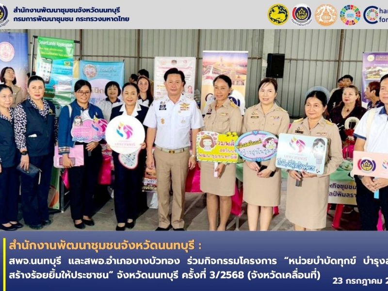 สำนักงานพัฒนาชุมชนจังหวัดนนทบุรี และสำนักงานพัฒนาชุมชนอำเภอบางบัวทอง ร่วมกิจกรรมโครงการ “หน่วยบำบัดทุกข์ บำรุงสุข สร้างร้อยยิ้มให้ประชาชน” จังหวัดนนทบุรี ครั้งที่ 3/2568 (จังหวัดเคลื่อนที่)