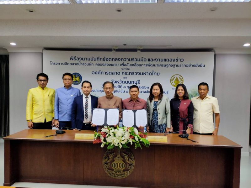 จังหวัดนนทบุรี – องค์การตลาด ร่วมลงนาม MOU จับมือผสานการจัดตลาดน้ำสวนผัก คลองสองนครา มุ่งผลักดันการท่องเที่ยวตลาดน้ำวิถีใหม่ พร้อมเส้นท่องเที่ยวโดยจักรยานชมความงามสองนที นนทบุรี-ตลิ่งชัน