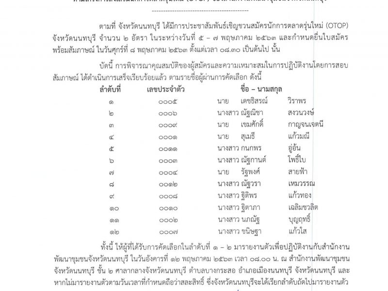 ประกาศ รายชื่อ ผู้ผ่านการคัดเลือก ตำแหน่ง นักการตลาดรุ่นใหม่ (OTOP) จังหวัดนนทบุรี