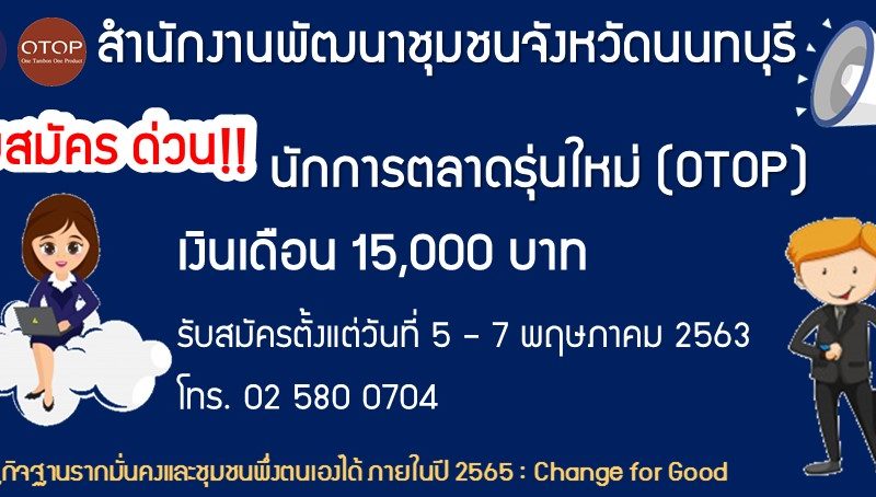 สำนักงานพัฒนาชุมชนจังหวัดนนทบุรี รับสมัคร “นักการตลาดรุ่นใหม่” (OTOP) 2 อัตรา